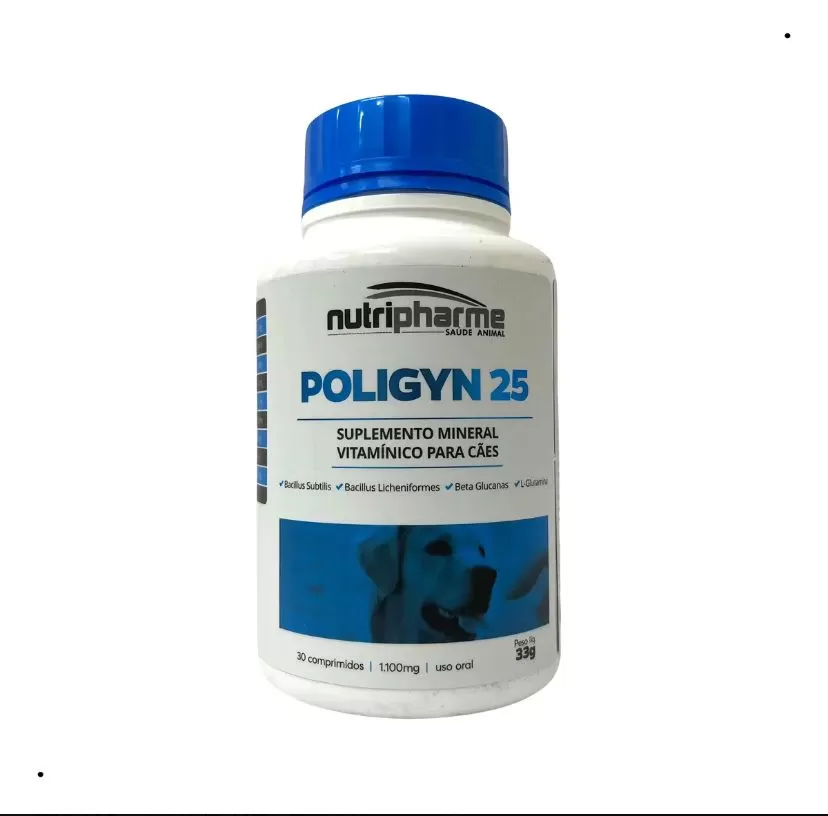Poligyn 25 é um suplemento mineral vitamínico desenvolvido para cães de todas as idades, indicado para complementar a alimentação e auxiliar na manutenção da saúde geral do animal. Sua fórmula é enriquecida com probióticos, vitaminas e minerais essenciais, contribuindo para o equilíbrio nutricional e suporte do organismo.