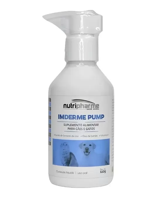 Imderme Pump é um suplemento alimentar indicado para cães e gatos de todas as idades, desenvolvido para promover a saúde da pele e melhorar a qualidade da pelagem. Sua fórmula contém ácidos graxos essenciais, vitaminas e antioxidantes que auxiliam na nutrição completa e no equilíbrio dermatológico dos pets.