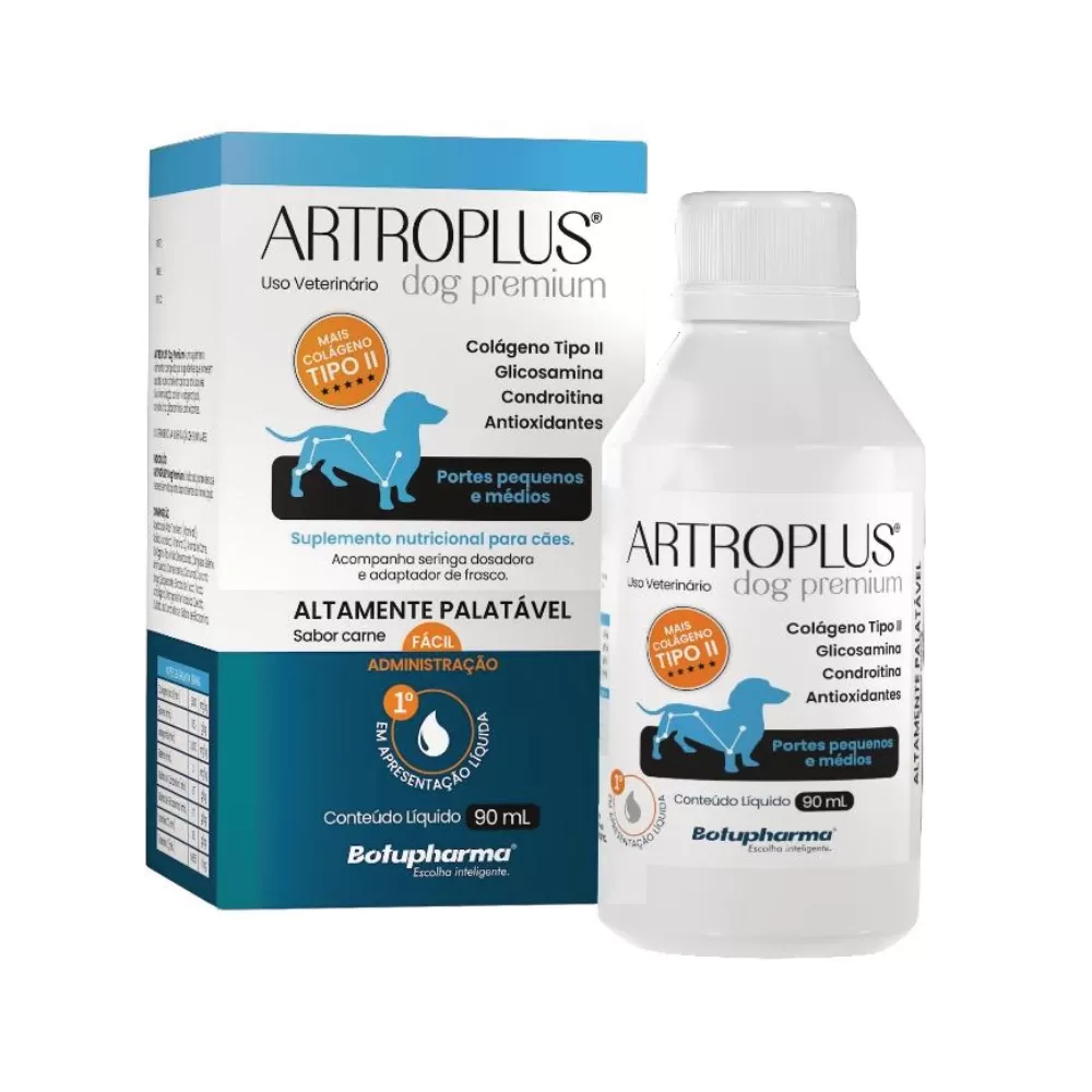 O Artroplus Dog 90 mL é um suplemento veterinário indicado para saúde das articulações de cães, ajudando na mobilidade e prevenção de problemas articulares.