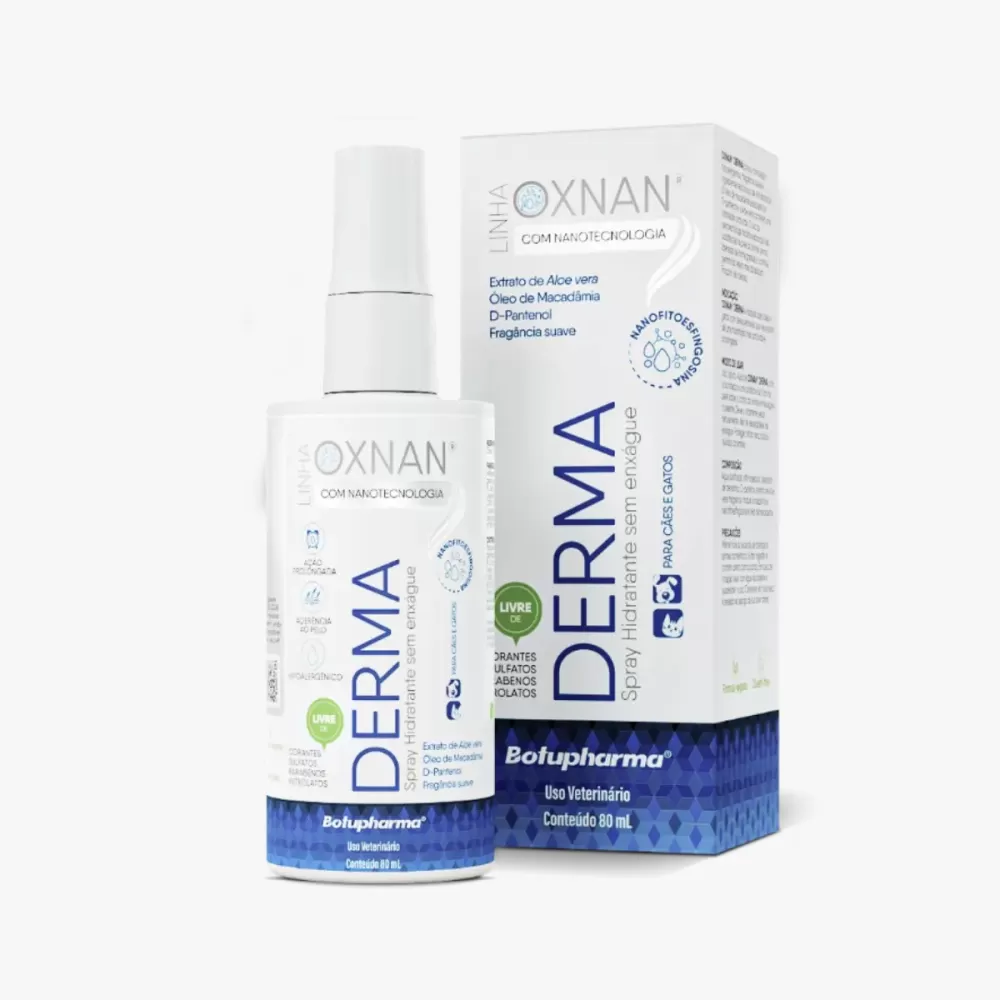 O Oxnan Derma 80 mL é um spray hidratante sem enxágue indicado para cães e gatos, especialmente desenvolvido para pele sensível e ressecada.