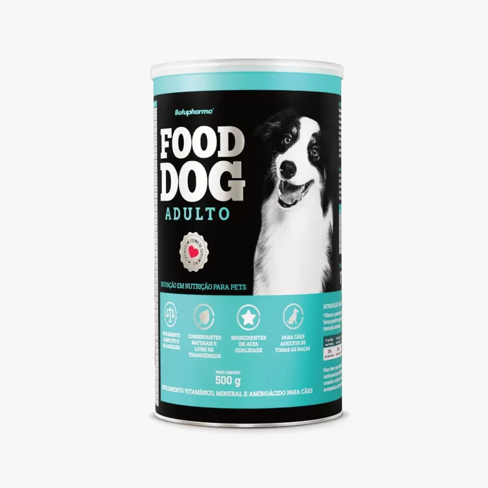 O Food Dog Adulto 500 g é um suplemento veterinário indicado para cães adultos que se alimentam com comida caseira, ajudando a tornar a dieta completa e balanceada.