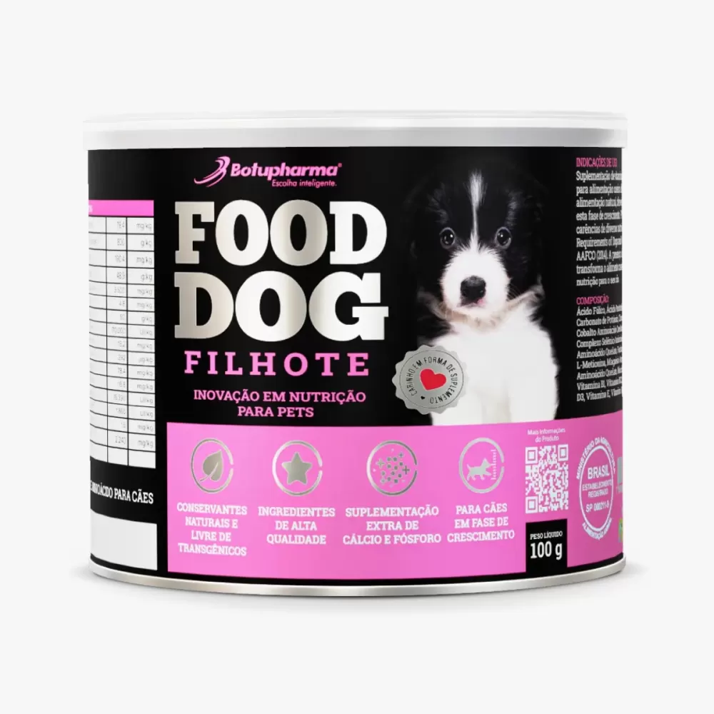 O Food Dog Filhote 100 g é um suplemento veterinário indicado para cães em fase de crescimento, especialmente os que recebem alimentação natural (caseira).