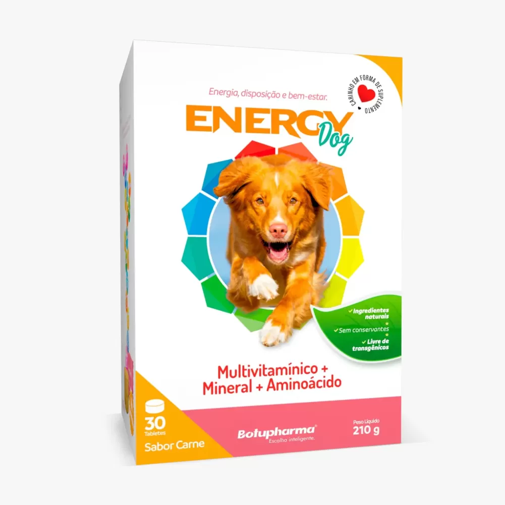 O Energy Dog é um suplemento multivitamínico completo indicado para cães de todas as idades, com foco em energia, disposição e saúde geral.